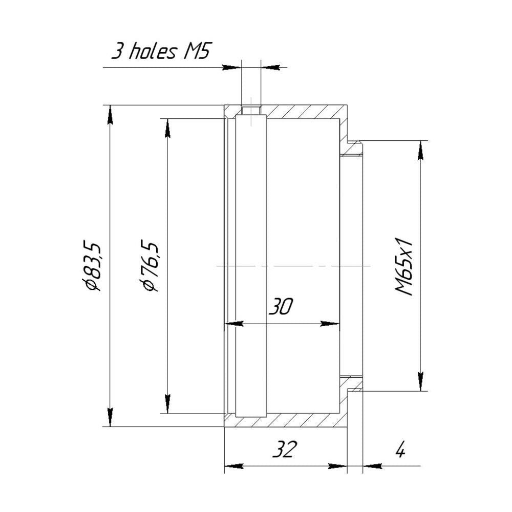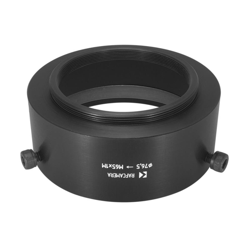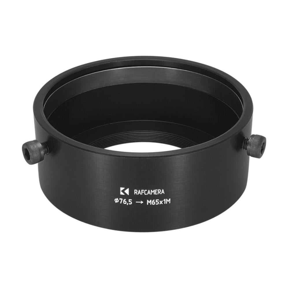 <ul> <li>Front side - 76.5mm inner diameter</li> <li>Rear side - M65x1 male thread</li> </ul> <p>This adapter allows using lenses with 76.5mm rear diameter of focusing helicoids with M65x1 thread.</p> <p>Made of high quality aluminium alloy.</p> <p>A lens is secured by three screws. Flat steel tension spring protects a lens body from damage.</p> <p><b>Known compatible lenses:</b></p> <ul> <li>Dallmeyer Pentac 8 inch F2.9 lens</li> </ul>