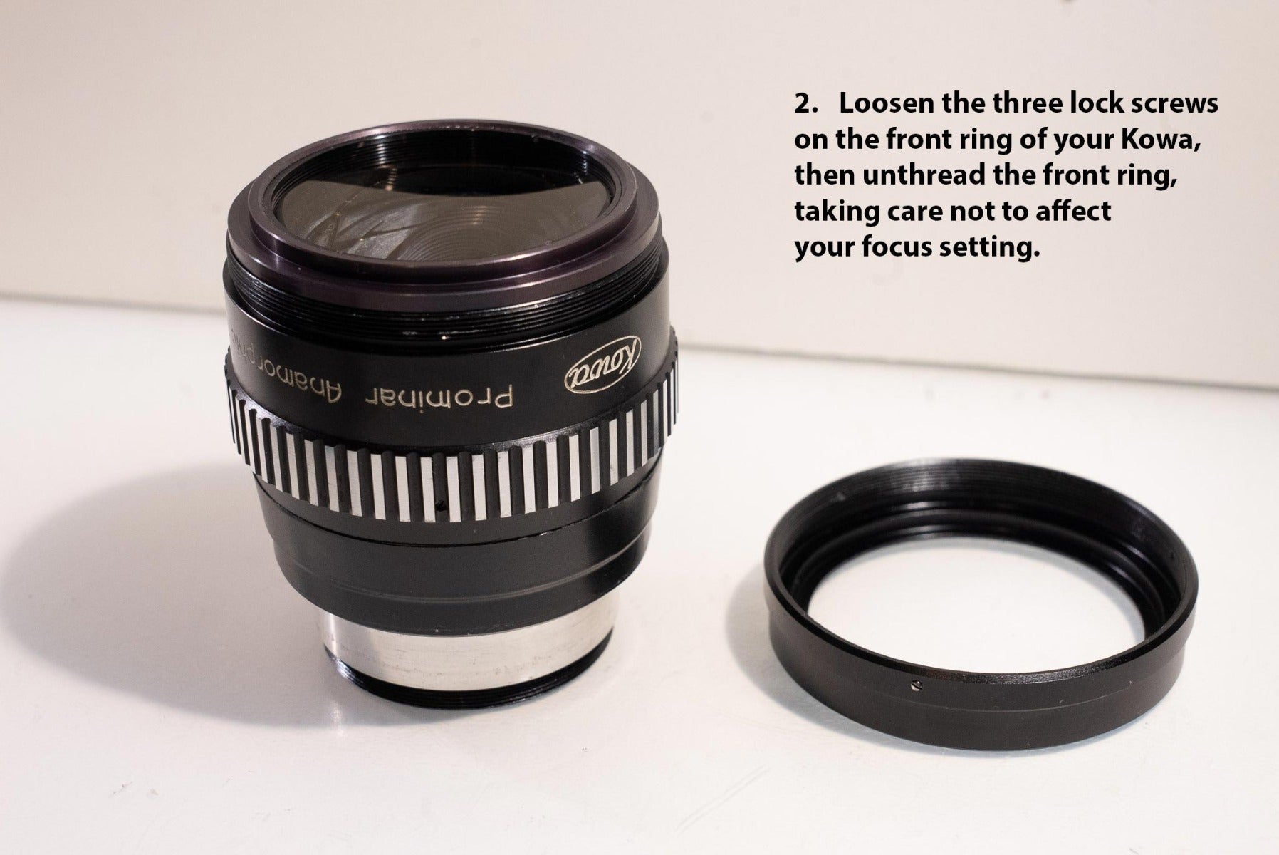 - Loosen the three lock screws on the front ring of your Kowa, then unthread the front ring, taking care not to affect your focus setting.