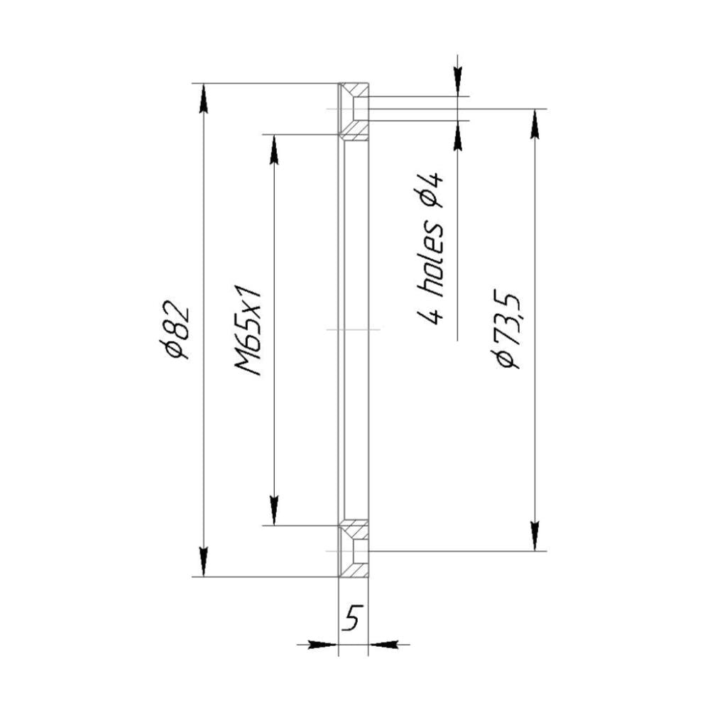 Made of anodized aluminim. Thickness is 4mm. Inner thread is M65x1.